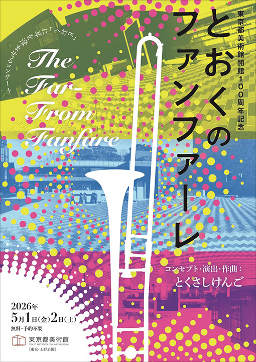 開館100周年記念として、とくさしけんごがオリジナルファンファーレを作曲。開館記念日である5月1日とその翌日に、16名のトロンボーン奏者群による記念コンサートを行います。また互いに離れた場所に位置する奏者のアンサンブルに耳を澄ませる、とくさしけんごの作曲作品「とおくのアンサンブル」も再演。東京都美術館のエスプラナードや中庭に金管楽器群の生音が反響し、まるで音に包まれるような体験となるでしょう。